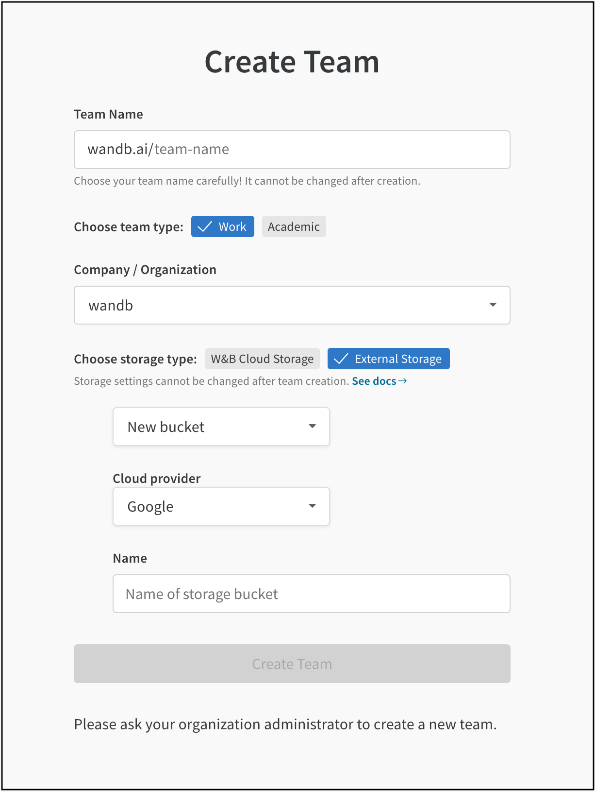 W&B チーム作成時にチームレベルでストレージバケットを設定するには: